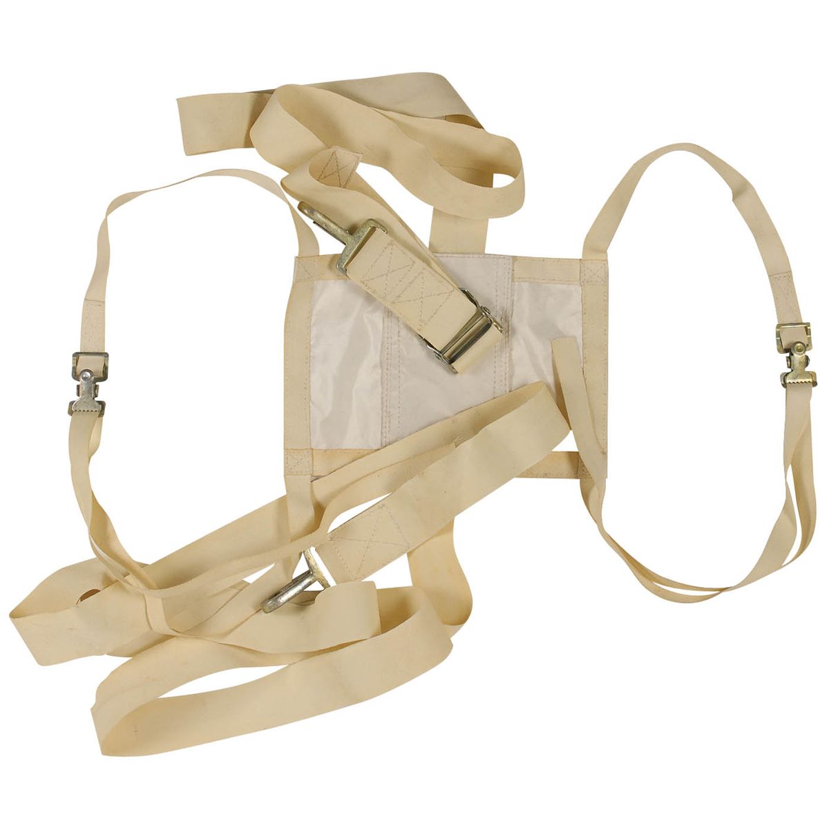 Apollo-era unmarked Beta fabric retainer measuring approximately 8 x 12 with four short 1-inch wide straps attached at the corners, and a very long 2-inch wide strap passing through a sleeve of the retainer. Clips and strap adjuster attached to the straps. In fine condition. Provenance: Charles Bell Estate.
