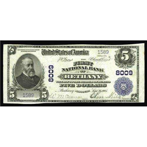 <B>Bethany, MO</B></I> - $5 1902 Plain Back Fr. 599 <B>The First NB</B></I> Ch. # 8009<BR>A crackling fresh example with white paper, pen signatures, and the look of a new note at first glance. <B>Extremely Fine-About Uncirculated,</B></I> with a miniscule spot out in the right margin.