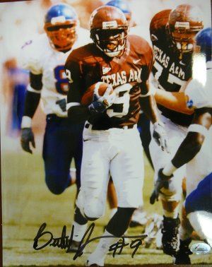 Bethel Johnson attended Texas A&M University, and finished his college football career with 117 receptions for 1740 yards (14.9 yards per reception), and 11 receiving touchdowns. His 117 receptions and 1740 receiving yards both rank second in school career records. Bethel Johnson has hand autographed this Texas A&M Aggies 8x10 Color Photo. Famous Ink Hologram and Certificate of Authenticity from Athlon Sports.