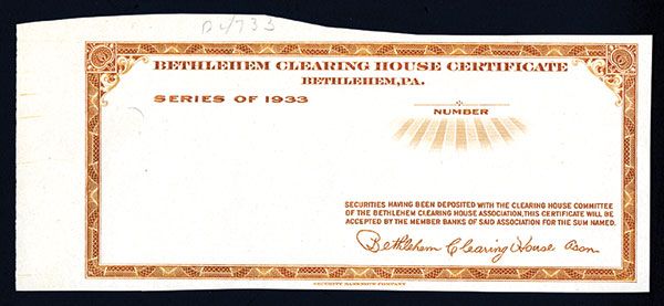 Bethlehem, Pennsylvania, 1933, Progress proof printed in chestnut brown on india paper without vignette “First House of Bethlehem” on left, or denomination. XF to Uncirculated condition. Rare production proof of this attractive depression scrip note. SBNC.