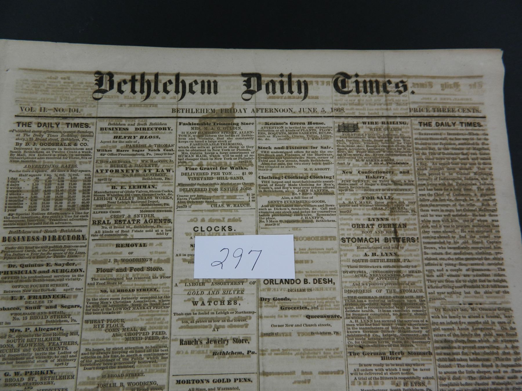 Bethlehem Daily Times (PA) from either 1868 or 1878, newspaper, Guaranteed Old!