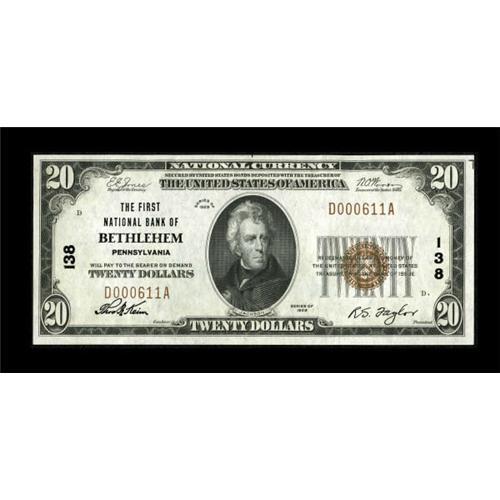 <B>Bethlehem, PA</B></I> - $20 1929 Ty. 1 <B>The First NB</B></I> Ch. # 138<BR> The attractiveness of this $20 indicates that the staff of this bank took great pride in their sheet cutting duties. <B>Choice Crisp Uncirculated.</B></I><BR><BR><b>Shipping:</b> Coins & Currency (<a target="_blank" href="http://www.heritageauctions.com/common/shipping.php">view shipping information</a>)