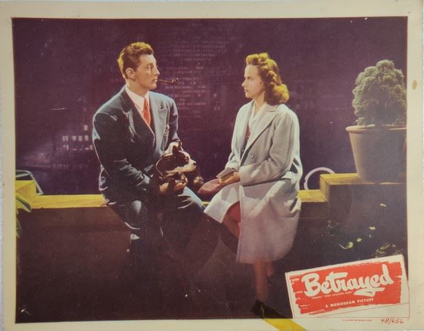 Betrayed/When Strangers Marry (Monogram Pictures, 1944). Film Noir, Mystery. Starring Dean Jagger, Robert Mitchum, Kim Hunter, Neil Hamilton, Rhonda Fleming, Marta Mitrovich, Claire Whitney, Dick Elliott, Byron Foulger, Milton Kibbee, George Lloyd, Edward Keane. Directed by William Castle. Minor edge wear, minor creases, small tears, tape, some stains. Fine. (11"x14").