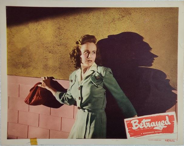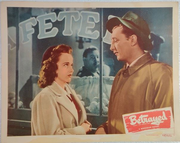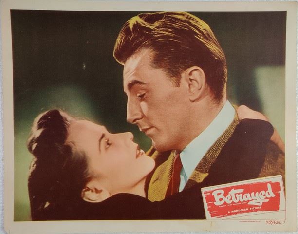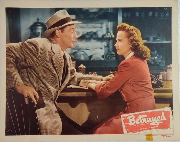 Betrayed/When Strangers Marry (Monogram Pictures, 1944). Film Noir, Mystery. Starring Dean Jagger, Robert Mitchum, Kim Hunter, Neil Hamilton, Rhonda Fleming, Marta Mitrovich, Claire Whitney, Dick Elliott, Byron Foulger, Milton Kibbee, George Lloyd, Edward Keane. Directed by William Castle. Minor edge wear, minor creases, small tears, tape, some stains. Fine. (11"x14").
