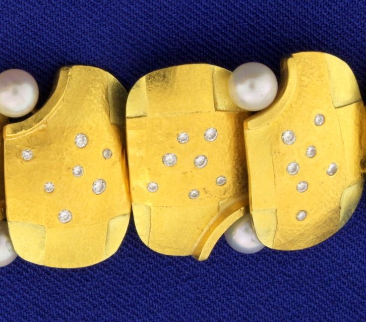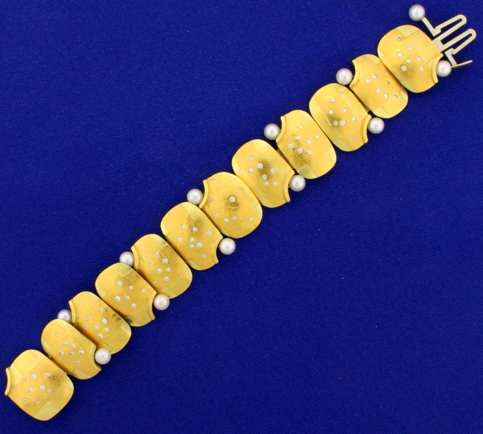 In 18-22-24k yellow gold, containing eighty six high quality .01ct diamonds of SI clarity/G color. Also contains twelve 5mm pearls with excellent color and luster. 6 3/4 inches long. Pair with lot 7075. 59.1g.