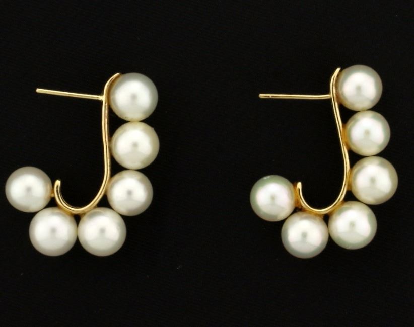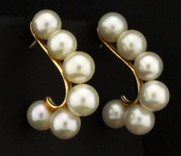 In 14k Yellow Gold. Contains twelve high quality 6.5mm Akoya Natural Pearls with excellent color and luster. 1 1/8" long, without backs, for pierced ears. 6.7g.