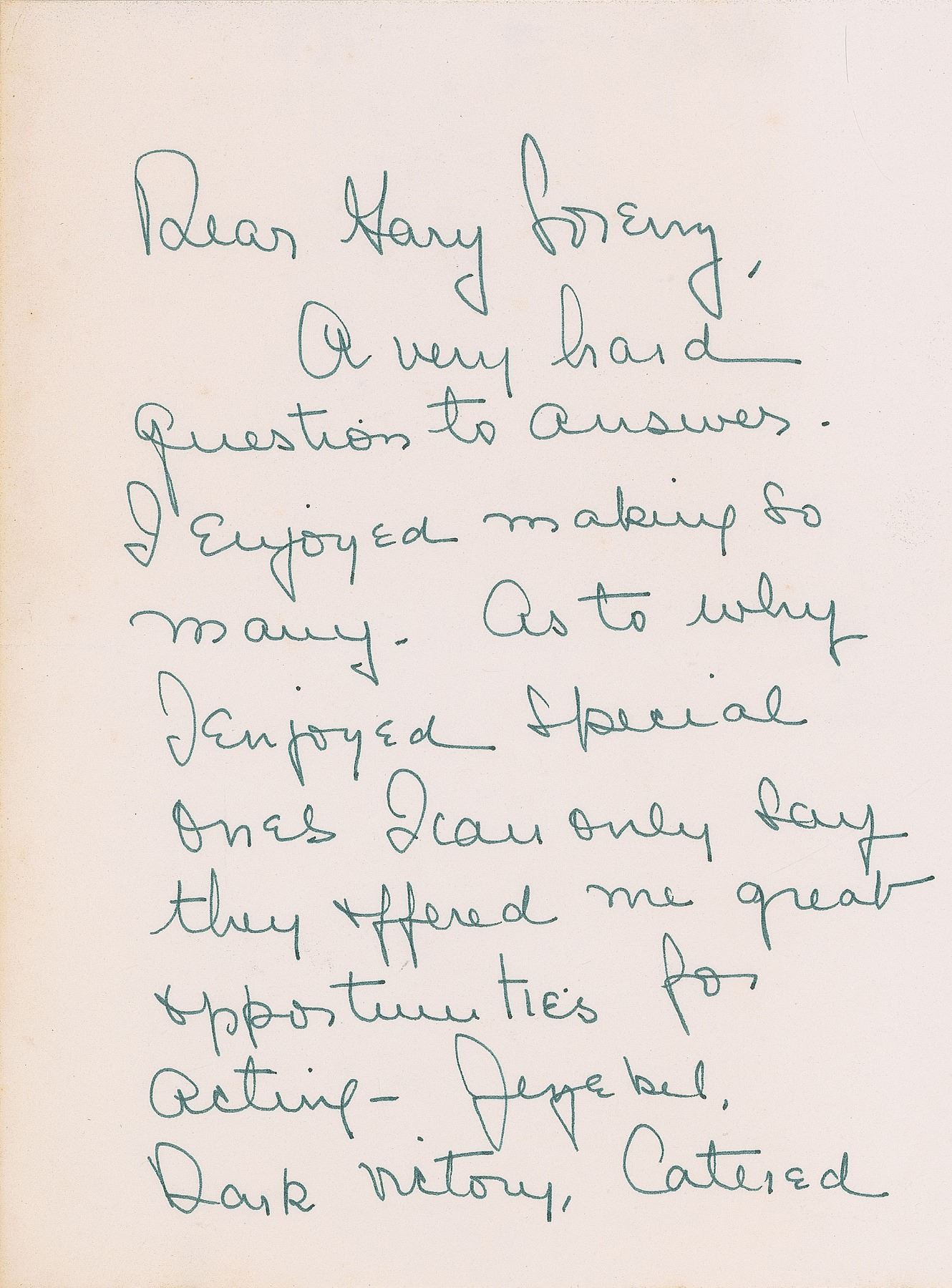 ALS, two pages, 6 x 7.75, no date. Letter discussing her favorite films, in full: "A very hard question to answer. I enjoyed making so many. As to why I enjoyed special ones I can only say they offered me great opportunities for acting—Jezebel, Dark Victory, Catered Affair, Baby Jane, All About Eve, Now Voyager. I could fill a book with naming them all." In fine condition.
