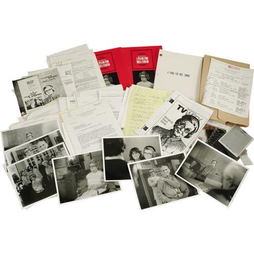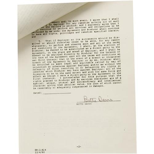 <B>Bette Davis "A Piano for Mrs. Cimino" Signed Contract Archive.</B></I> Includes a contract for the 1982 TV movie dated November 21, 1981 and signed thrice by Davis, a copy of the script, movie stills with negatives, color slides with negatives, press clippings, and two promotional brochures. In overall Very Fine to Excellent condition with mild wear.<BR><BR><b>Shipping:</b> Flat Material, Large (<a target="_blank" href="http://www.heritageauctions.com/common/shipping.php">view shipping information</a>)