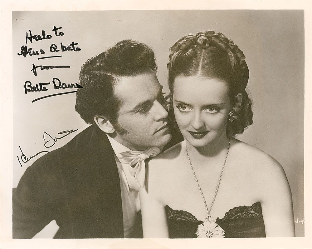 Matte-finish 10 x 8 photo of Davis and Fonda for Jezebel, signed and inscribed in black felt tip “Hello to Gene Abate from Bette Davis” and “Henry Fonda.” In fine condition.