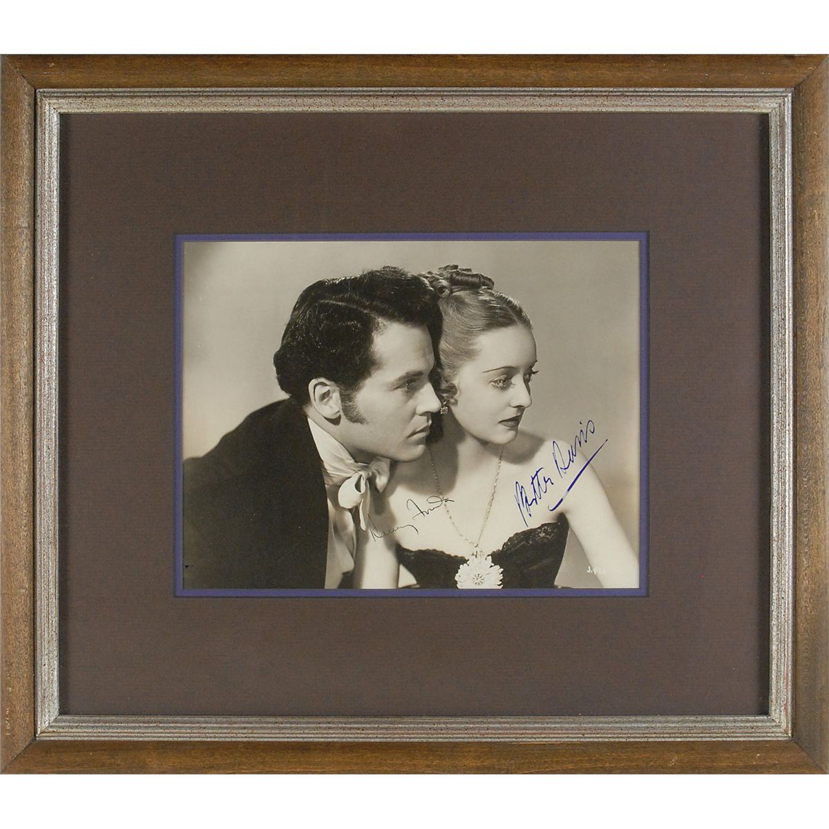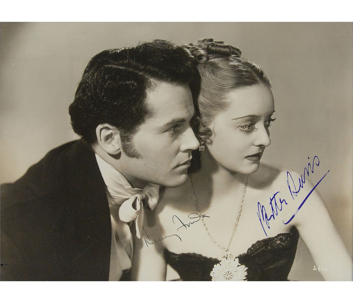 Vintage glossy 9 x 7 photo of Davis and Fonda as they appeared in the highly-acclaimed 1938 film Jezebel, signed in purple fountain pen by Bette Davis and in black fountain pen by Henry Fonda. Double-matted and framed to an overall size of 16.75 x 14.5. Some scattered light creases, otherwise fine condition. Davis would earn her second Academy Award for her role in the film, which garnered an additional four nominations.