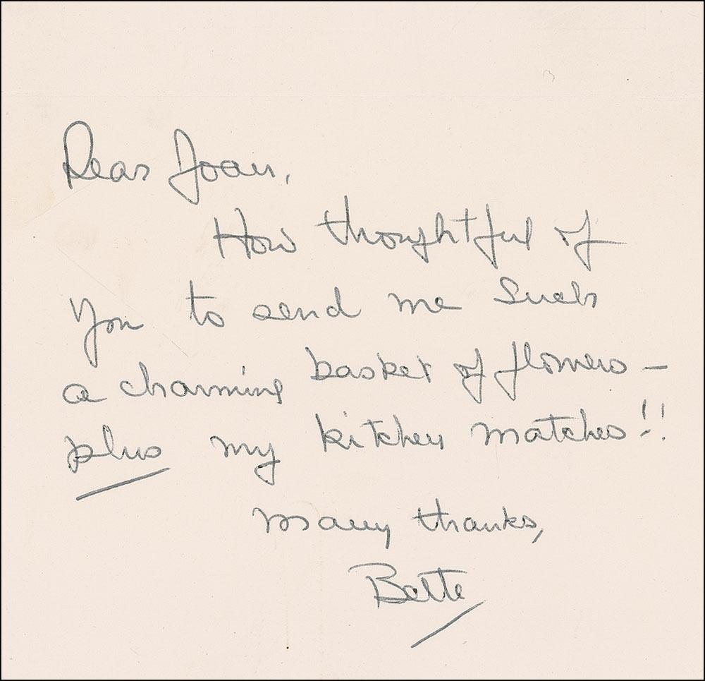 ALS signed “Bette,” one page, 5 x 4, no date. Brief letter of thanks to Joan. “How thoughtful of you to send me such a charming basket of flowers–plus my kitchen matches!!” In fine condition, with a few light bends and creases, and a couple rusty paperclip marks and soiling to cover.