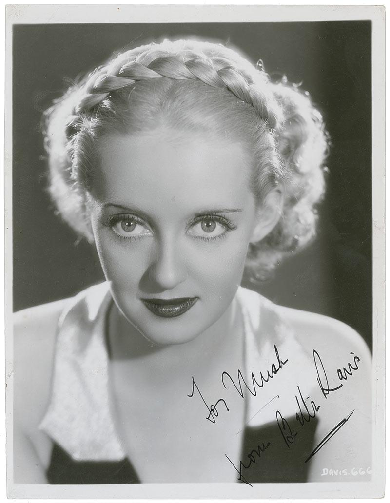 Great vintage glossy 7.75 x 10 head-and-shoulders photo, signed and inscribed in-person in black fountain pen “For Mush, from, Bette Davis.” In fine condition, with trimming to left edge, light overall surface impressions including a paperclip impression at right edge, and signature contrast to portion of inscription and beginning of first name. A wonderful, less common pose of a youthful Davis, from the well-known “Mush” collection with notation on reverse indicating the signature was obtained at the “Hotel Algonquin, March 29, 1936.”