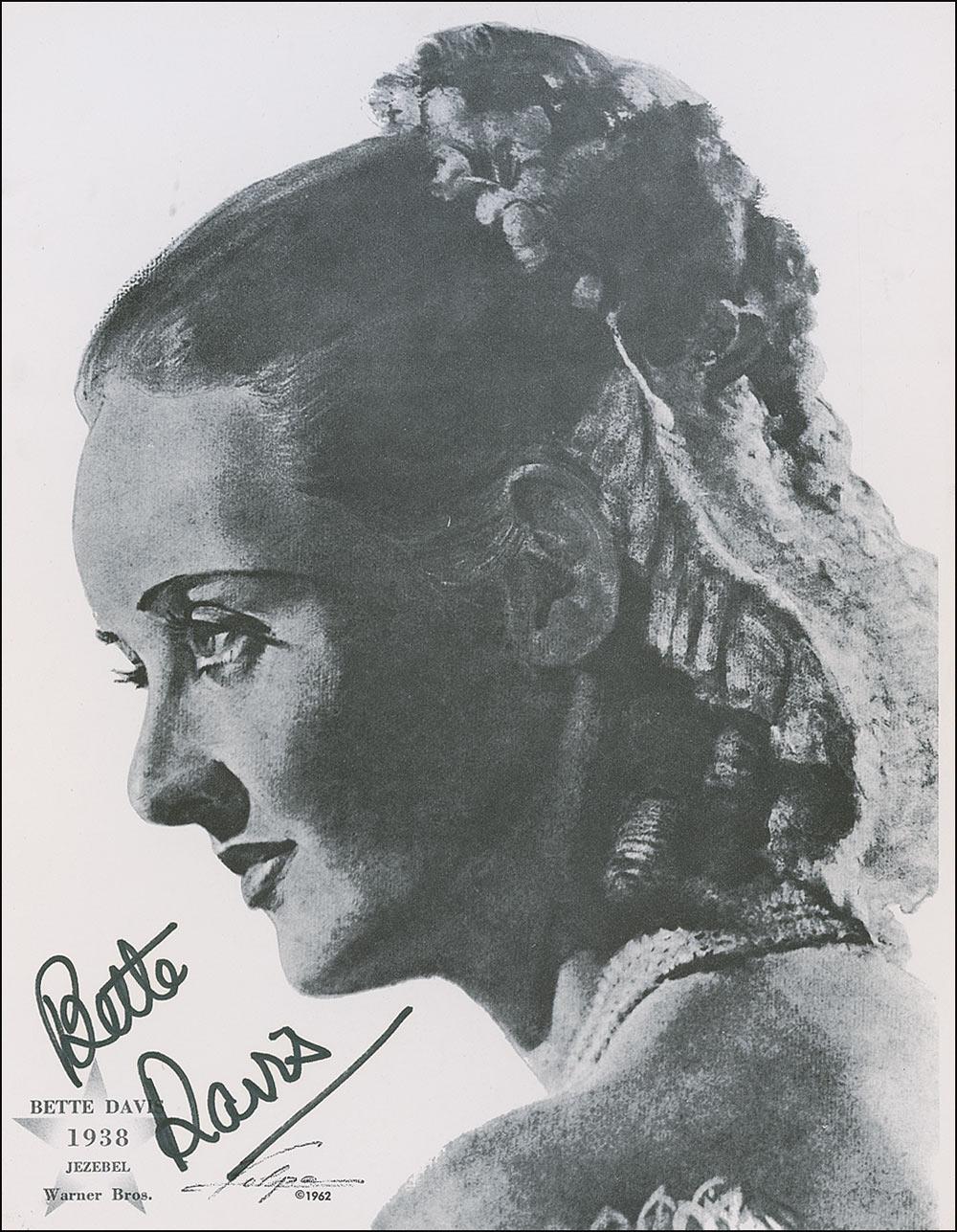 Two items: a color glossy 8 x 10 photo of Bette Davis signed in black felt tip; and an 8.25 x 10.5 Volpe print also signed in black felt tip by Davis. In overall fine condition, with trimmed edges to the print.