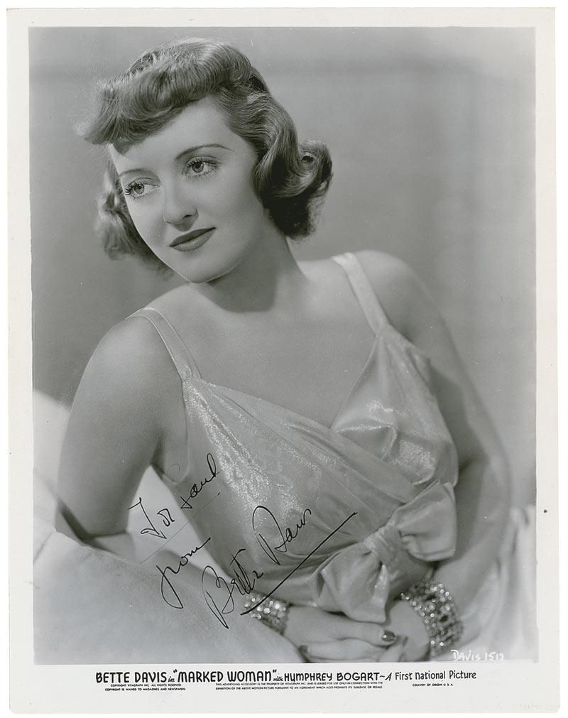 Vintage glossy 8 x 10 First National Picture promotional photo of Davis as she appeared in Marked Woman, signed and inscribed in-person in fountain pen “For Saul from Bette Davis.” Reverse of photo bears collector’s stamp date of July 20, 1940, the date the signature was acquired. In fine condition, with scattered light creases and surface marks, and some light rippling to emulsion. Saul Goodman Collection.