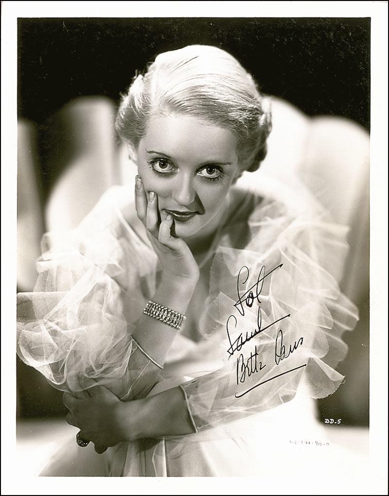 Lovely vintage glossy 8 x 10 photo of a young Davis leaning forward and resting her head in her hand, signed and inscribed in-person in fountain pen “Saul, Bette Davis.” Davis has also crossed out a misspelled inscription. Reverse of photo bears collector’s stamp date of April 10, 1936, the date the signature was acquired. In fine condition, with some scattered light surface marks, scattered mild rubbing to emulsion, and a hint of trivial silvering. Saul Goodman Collection.