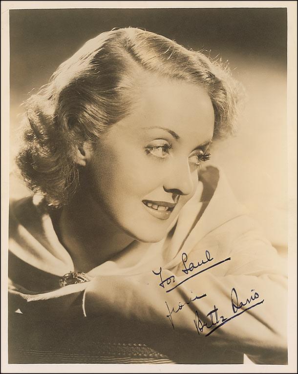 Vintage sepia matte-finish 8 x 10 profile photo, signed and inscribed in-person in fountain pen, “For Saul, from Bette Davis.” Reverse of photo bears collector’s stamp date of June 23, 1936, the date the signature was acquired. In fine condition. Saul Goodman Collection.