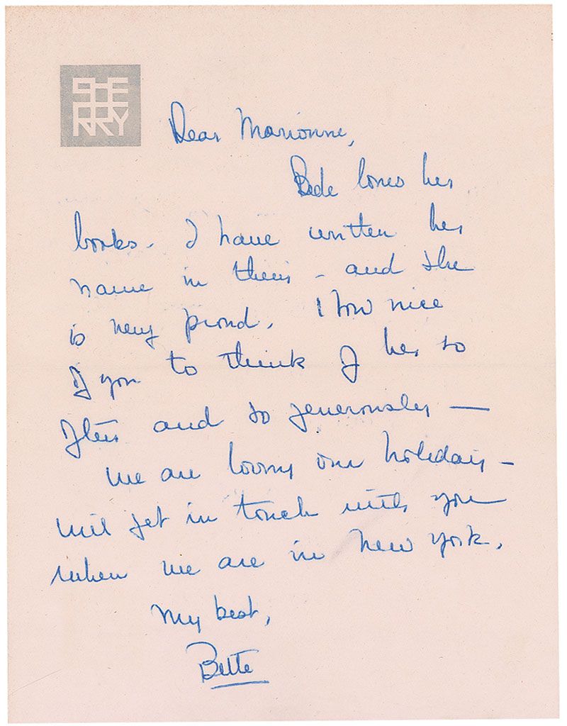 ALS signed “Bette,” one onionskin page, 6 x 8, personal letterhead, no date. Letter of thanks to Marianne. In part: “Bede loves her books. I have written her name in them—and she is very proud. How nice of you to think of her so…generously.” In fine condition, with a central horizontal fold and a light diagonal crease.