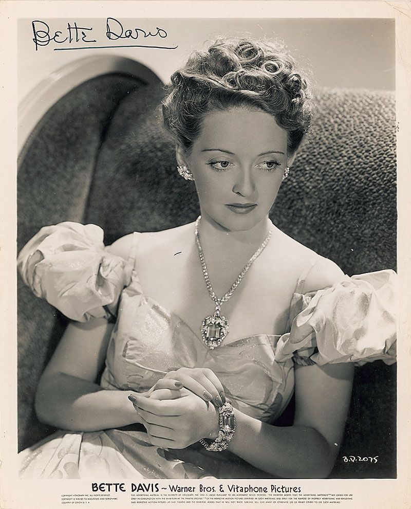 Glossy 8 x 10 Warner Bros. publicity photo of Davis wearing a dazzling necklace, signed in black felt tip. Scattered surface bends, dings to left edge, and a stray mark to her chest area, otherwise fine condition.