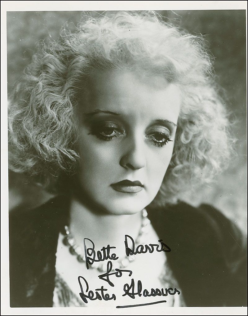 Glossy 7.75 x 10 head-and-shoulders photo from early in her career, signed and inscribed in black felt tip, “Bette Davis for Lester Glasswer.” In fine condition, with a few scattered surface marks and impressions.