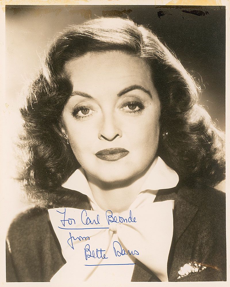 Matte-finish 8 x 10 portrait of Davis, signed and inscribed in blue ballpoint to a Hollywood prop master, “To Carl Beonde, from Bette Davis.” Toned adhesive remnants along the upper border, otherwise fine condition.