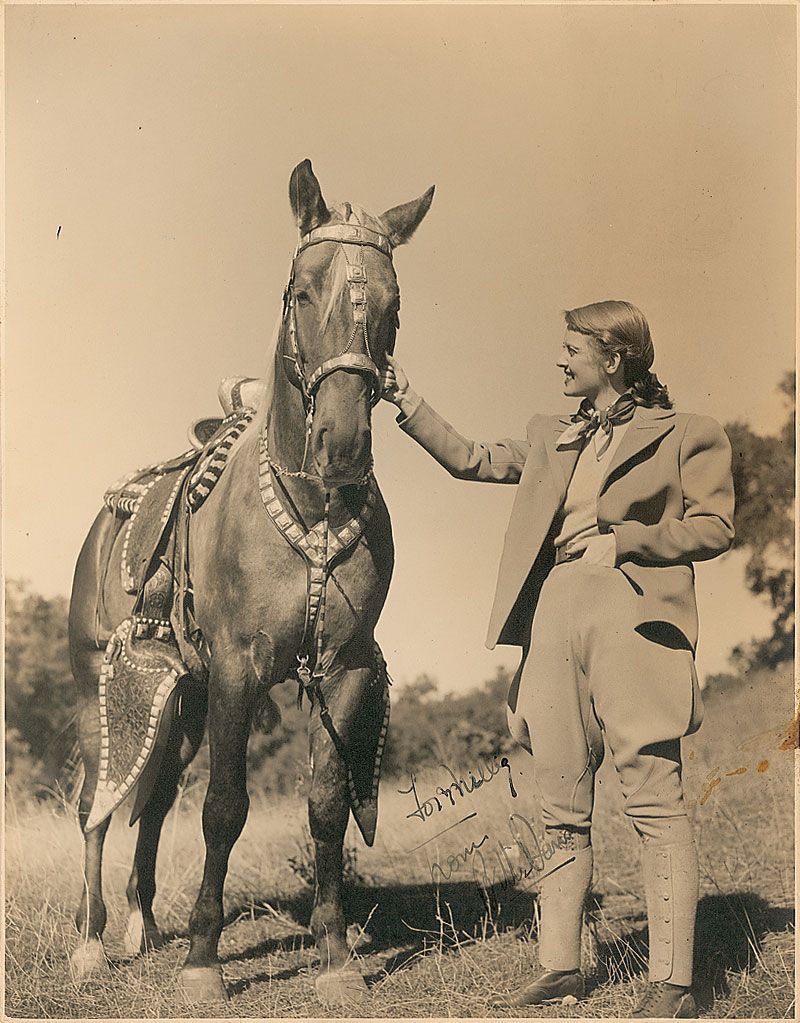 Vintage matte-finish 10.5 x 13.5 photo of Davis with a horse, signed and inscribed in black ink. In very good condition, with a noticeable area of soiling to the right edge, light rippling to bottom edge, moderate contrast to signature against the dark background, and a portion of the inscription altered in an unknown hand. Originates from the personal collection of Victor Johnson, who worked as a gaffer at Warner Bros. for over forty years.