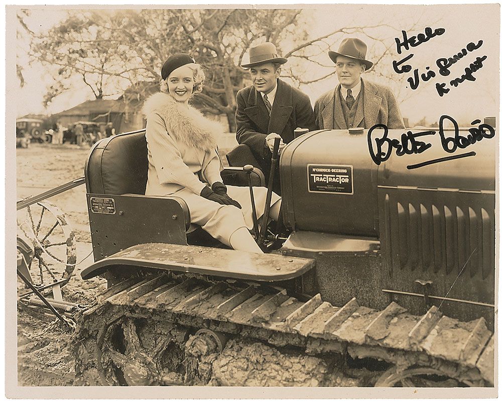 Glossy 9.75 x 7.75 photo of Davis behind the wheel of a tractor, signed and inscribed in black felt tip to the wife of former California Governor Goodwin Knight, “Hello to Virginia Knight, Bette Davis.” Slightly trimmed edges and a diagonal crease to lower right corner, otherwise fine condition.