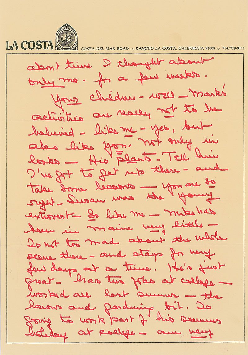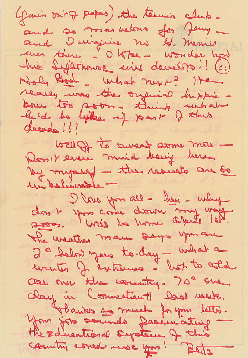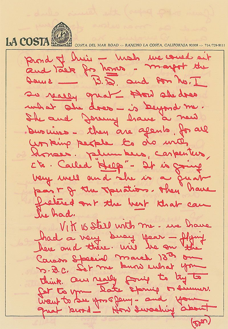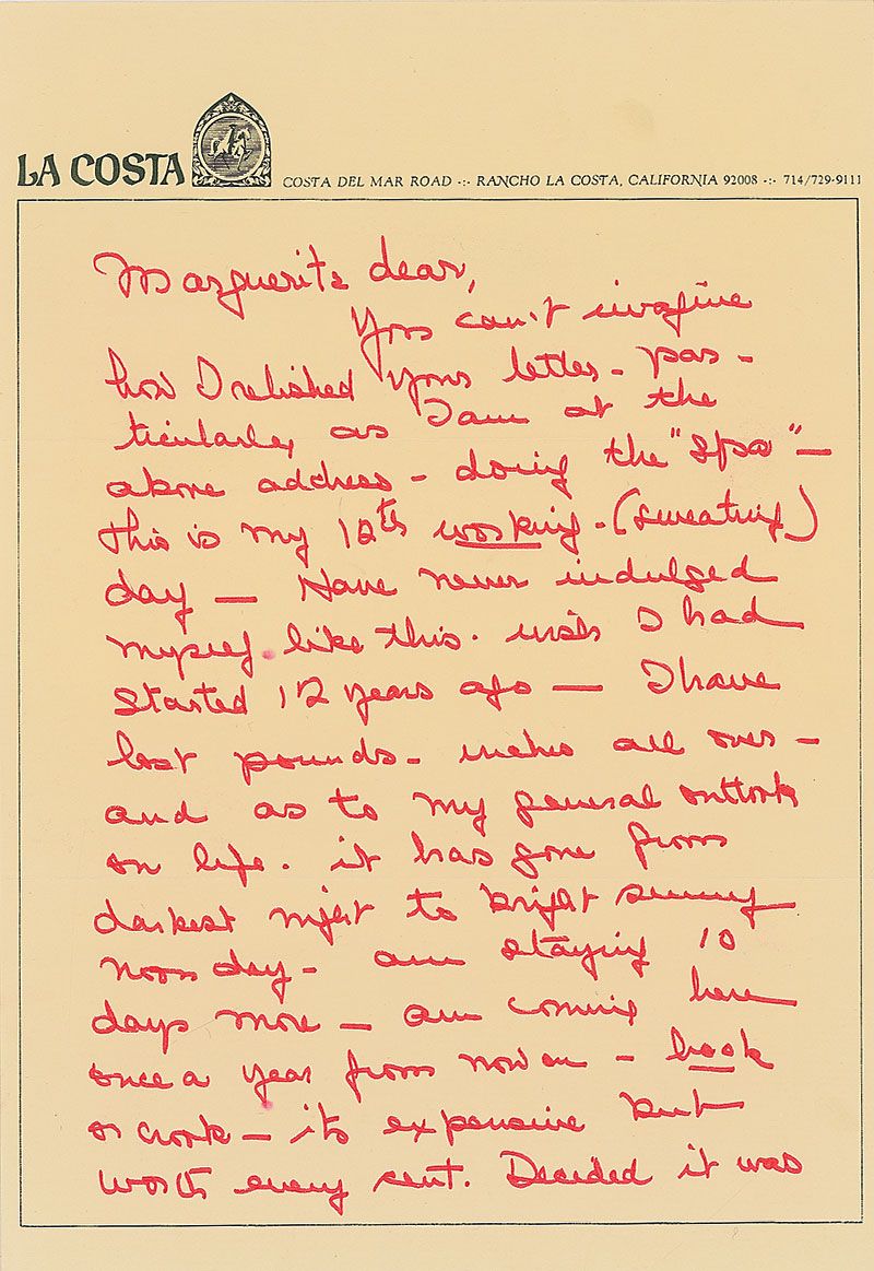 ALS signed “Bette,” four pages on three sheets, 7.25 x 10.25, La Costa letterhead, March 8, 1972. Letter to her former sister-in-law, Jenny Merrill. In part: “I am at the above address—doing the ‘spa’…Have never indulged myself like this…as to my personal outlook on life, it has gone from darkest night to bright sunny noon day…Vik is still with me, we have had a very busy year…will be on the Carson special March 13th on N. B. C. Let me know what you think.” In fine condition. Accompanied by the original mailing envelope, addressed in Davis’s own hand.