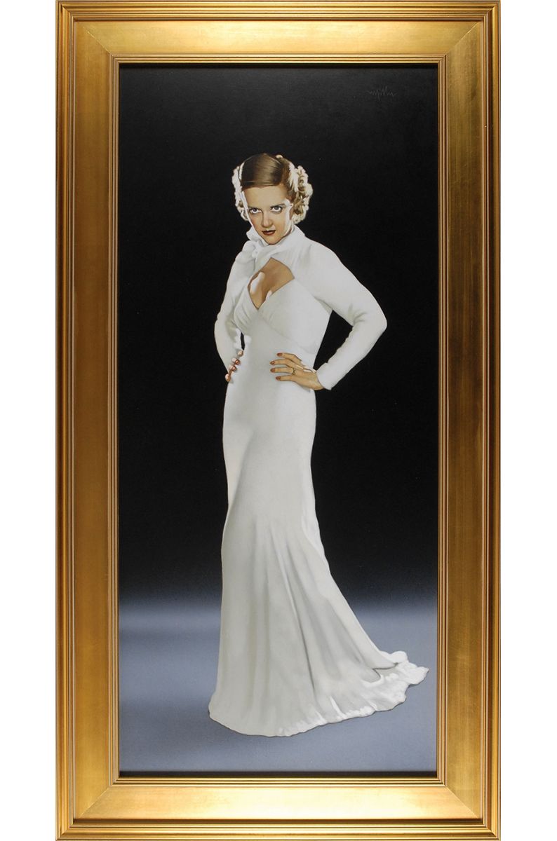 Stunning oversized original painting entitled ‘Young Betty Davis,’ by artist Arthur K. Miller in 2010, acrylic on Masonite, 14.5 x 32.5, depicting a full-length image of a young Davis in a long white gown, her hands on her hips, and staring ahead intently. Signed in the upper background, “Miller.” Framed to an overall size of 20.5 x 38.5. In very fine condition. An artist from York Beach, Maine, Miller’s acrylic paintings are collected internationally. They have graced the covers of many publications, and some were featured in a one-man show at the National Baseball Hall of Fame for more than five years. A glamorous portrait capturing Davis’s beauty and intensity. Oversized.