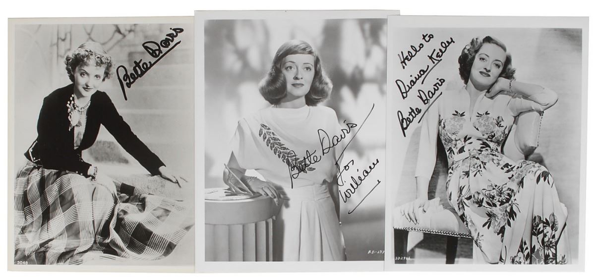 Three glossy 8 x 10 photos of the esteemed actress, each signed in black felt tip by Davis, with two inscribed. In overall very good to fine condition.