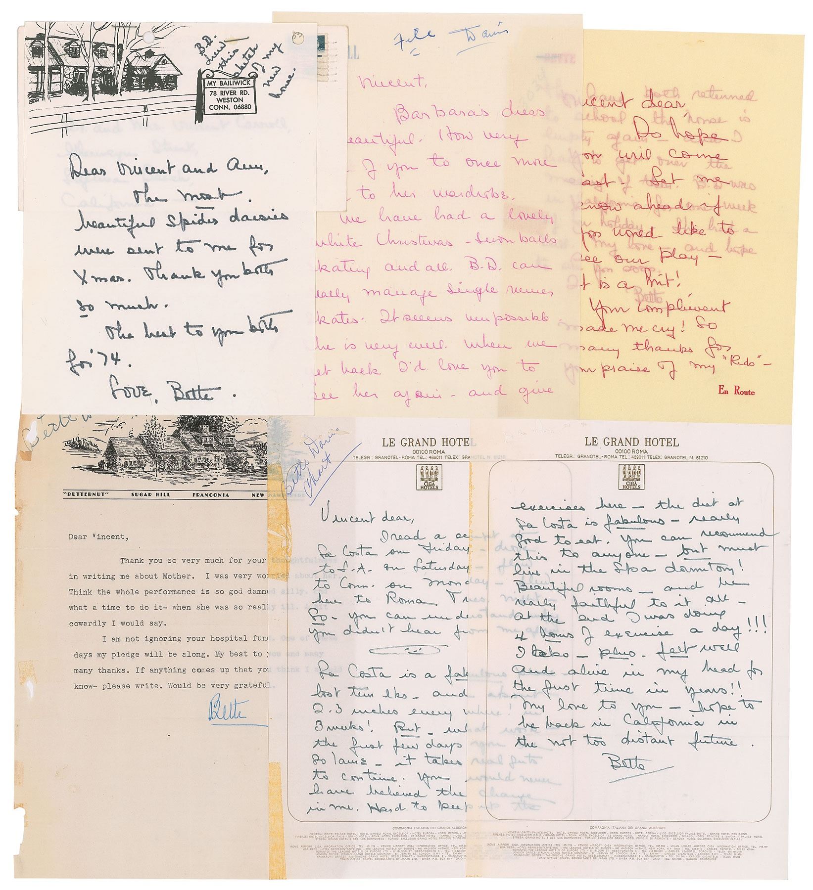 Notable group lot of seven letters from legendary actress Bette Davis, signed either "B. D." or "Bette," consisting of six ALSs and one TLS, 12 total pages, ranging in size from 5 x 4 to 7.25 x 10.5, dated between 1953 and 1974. All letters are addressed to Dr. Vincent Carroll, with subject matter consisting mostly of Davis conveying her thanks for sent dresses and flowers. Highlights from the letters: "As you no doubt know this operation is the end. God knows when I'll ever be myself again. What a bruised face—and what an ache!"; "Do hope you will come east. Let me know ahead if you would like to see our play—It is a hit!"; "Thank you so very much for your thoughtfulness in writing me about Mother. I was very worried about her. Think the whole performance is so god damned silly, and what a time to do it—when she was really ill. A bit cowardly I would say." In overall fine condition. Also includes a handwritten note from her daughter, Barbara Sherry, and two handwritten letters from her husband, actor Gary Merrill.