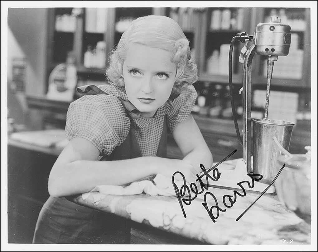 Glossy 10 x 8 photo of a young Davis hanging out at a soda fountain, signed in black felt tip. In fine condition, with a few scattered creases and dings.