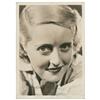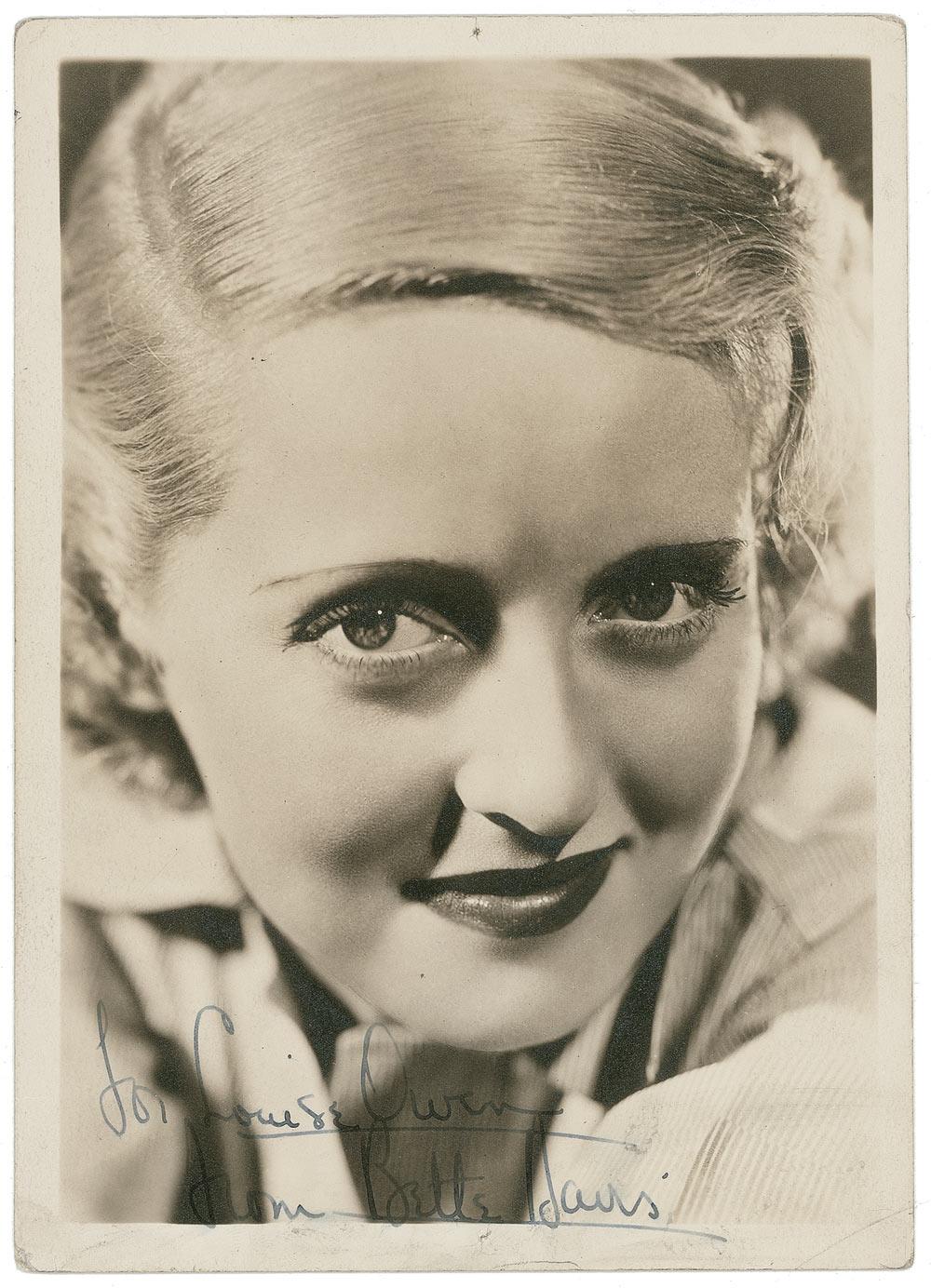 Vintage matte-finish 5 x 7 close-up photo, signed and inscribed in fountain pen “For Louise Owen from Bette Davis.” Some light soiling around signature, a couple trivial brushes to signature, and a tack hole to top and bottom edge, otherwise fine condition.