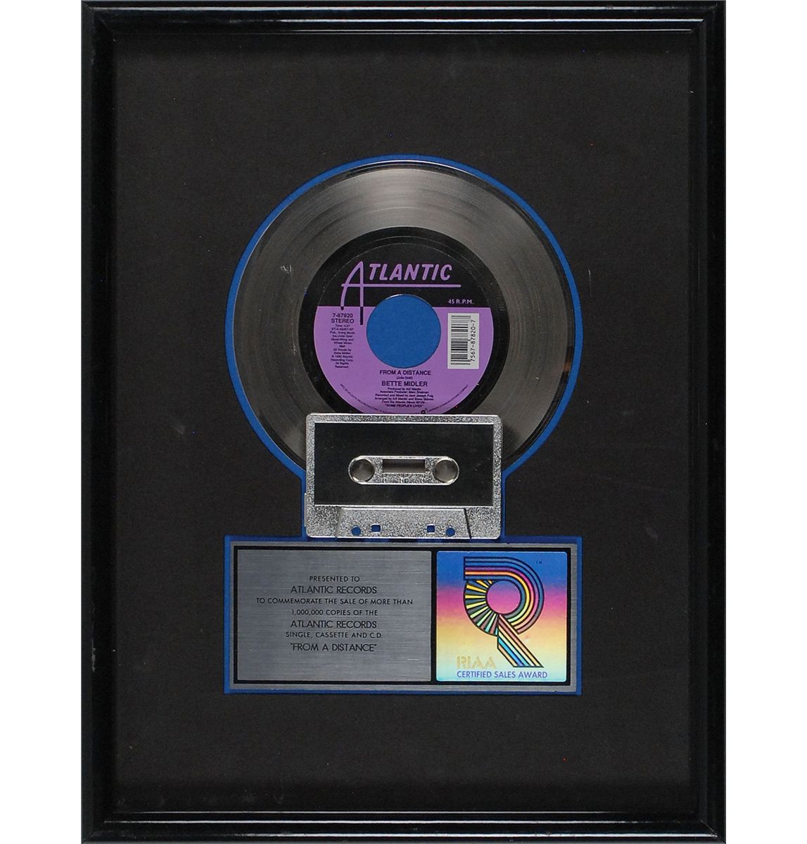 Official R-hologram style platinum sales award presented to “Atlantic Records to commemorate the sale of more than 1,000,000 copies of the Atlantic Records single, cassette, and C.D. ‘From A Distance.’” Single and cassette are framed with the plaque to an overall size of 13 x 17. In fine condition.