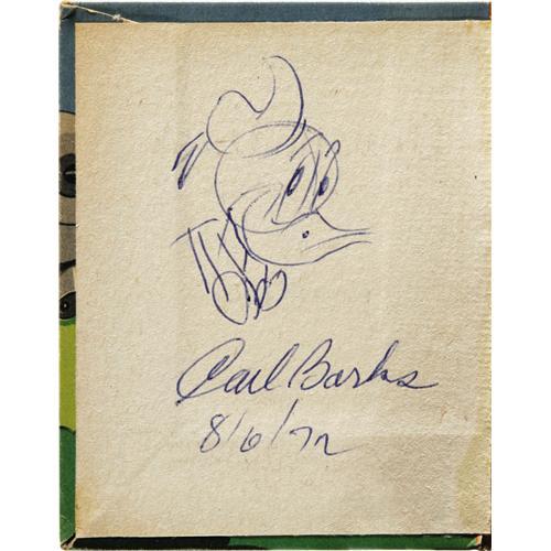 <B>Better Little Book 1486 Donald Duck "Up In The Air" with added Carl Barks Sketch (Whitman, 1945) Condition: VF.</B></I> This wonderful <B>Big Little</B></I> features a story adapted from the Carl Barks comic book classic, "Mystery of the Swamp", which was originally included as a backup story in <B>Four Color</B></I> #62. Barks' art was used for the black and white illustrations in this edition, and to make things even sweeter, Barks added a sketch (done in blue ball-point ink) of Donald on the inside front cover. Wow! The sketch is dated 8/6/72. Overstreet 2006 FN value= $87; VF/NM value = $200.<BR><BR><b>Shipping:</b> Books & Catalogs (<a target="_blank" href="http://www.heritageauctions.com/common/shipping.php">view shipping information</a>)