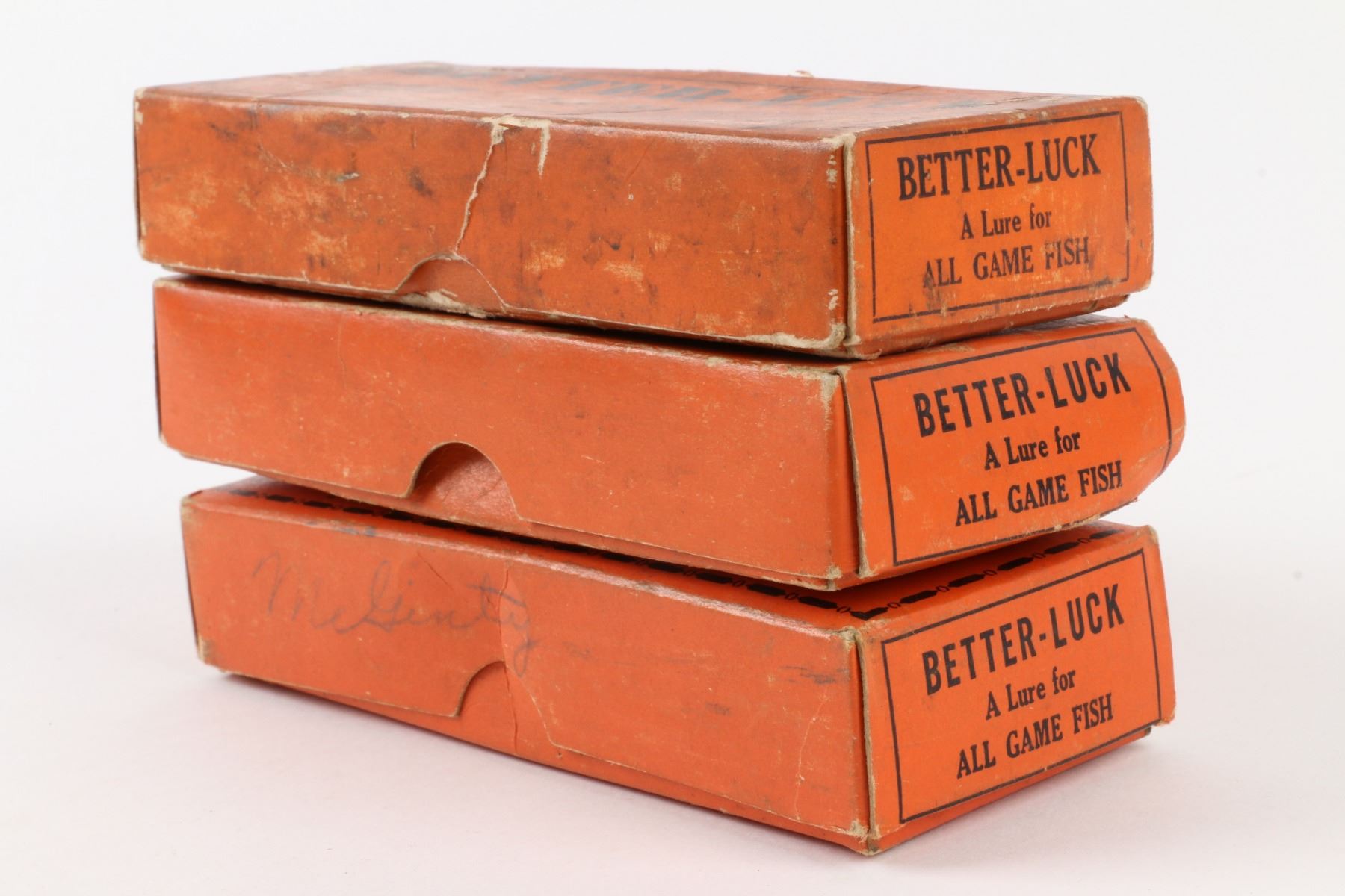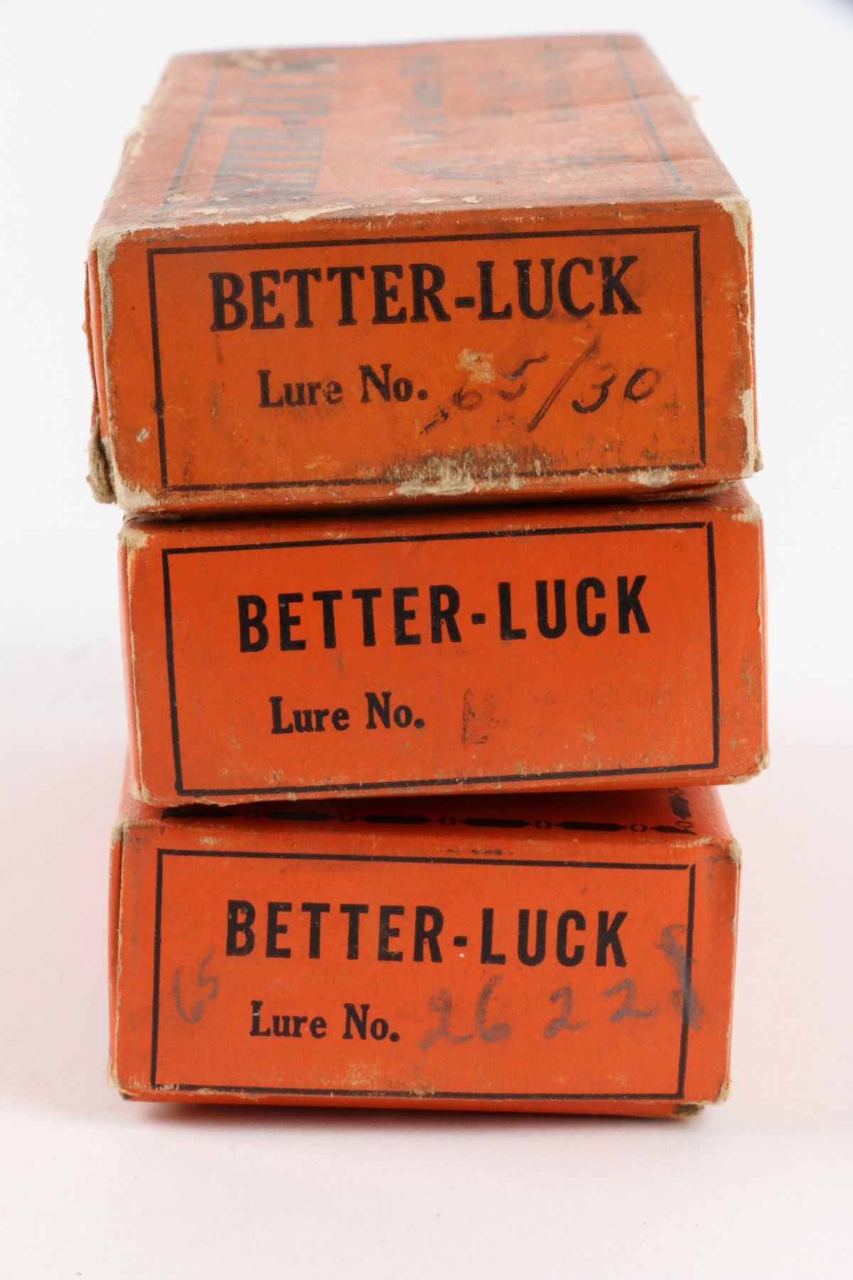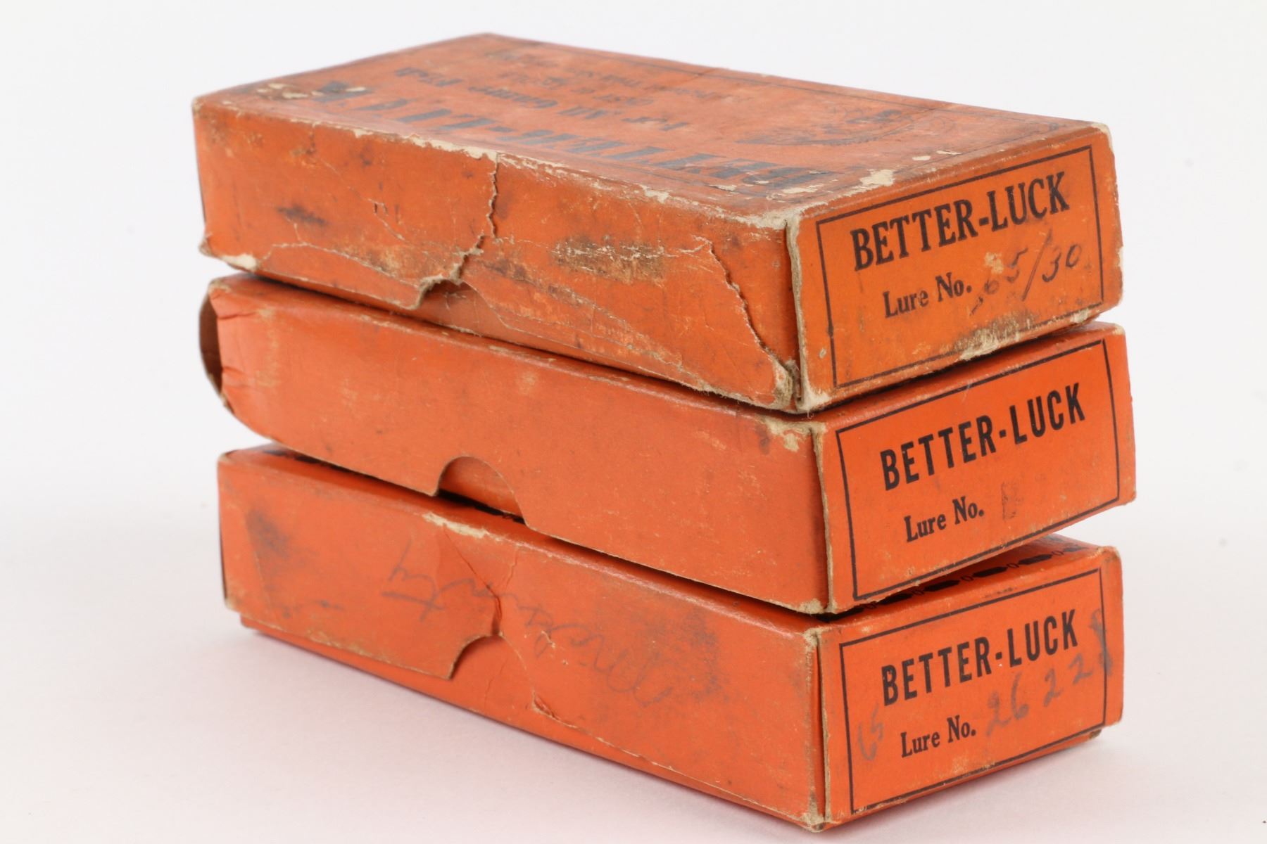 Lucky Strike Bait Works, Canada. 1940s. Material: Wood. Quantity: 3. Grade: G. 5.25" boxes. Est. $100-125.