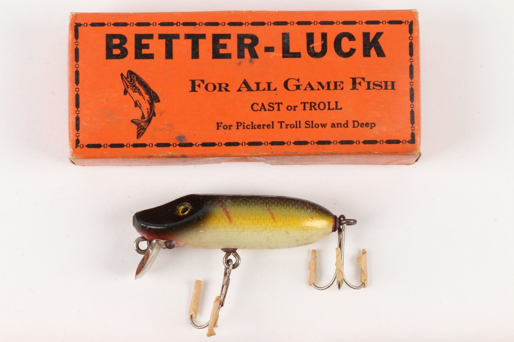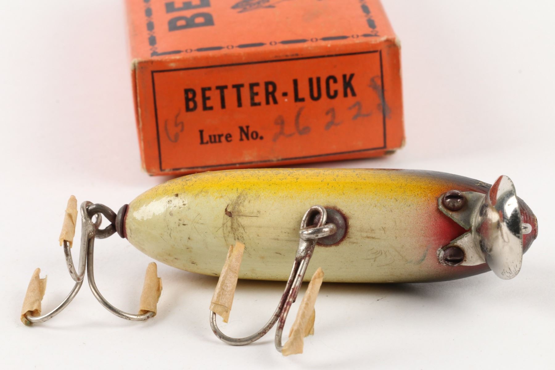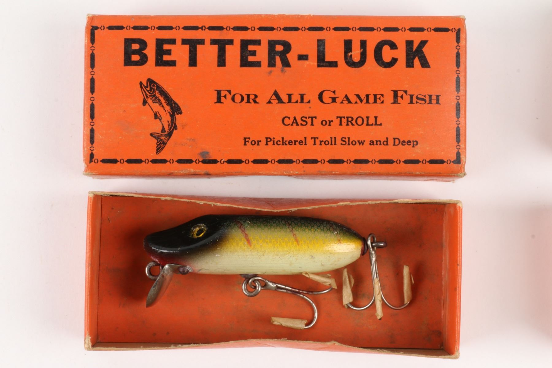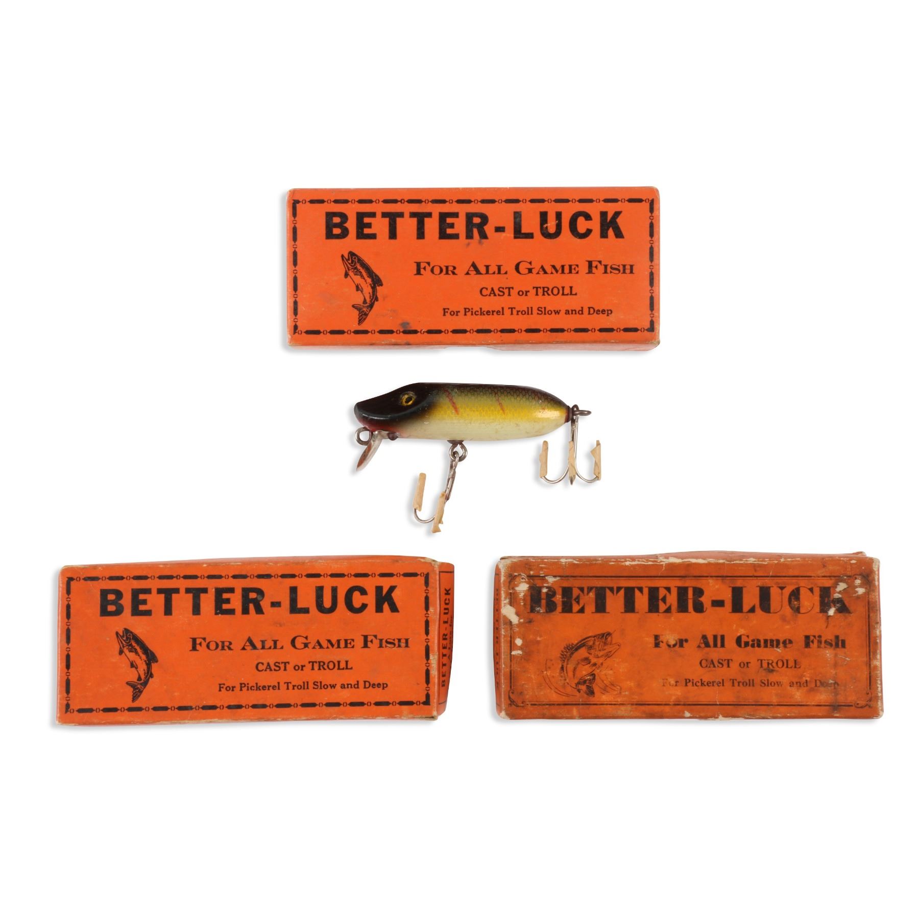 Lucky Strike Bait Works, Canada. 1940s. Material: Wood. Quantity: 3. Grade: G. 5.25" boxes. Est. $100-125.