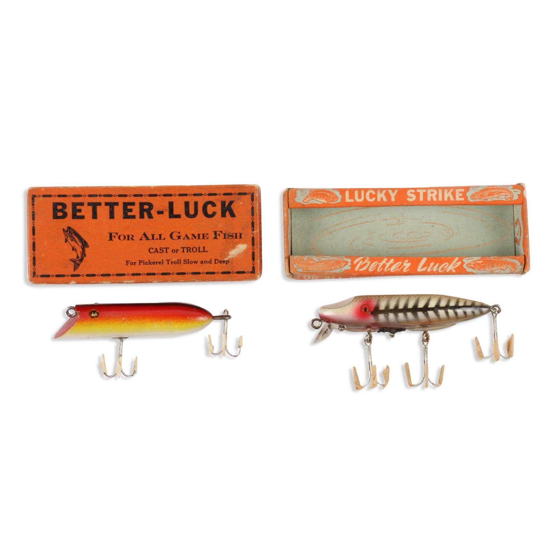 Lucky Strike Bait Works, Canada. 1940s. Material: Mixed. Quantity: 2. Grade: VG. 5.25" boxes. Est. $125-150.