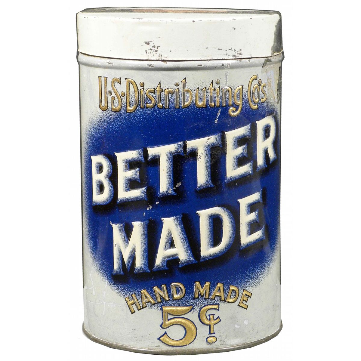 Better Made 5 Cent Cigar Tin-25's. Advertising sticker on side for Groceries, notions, harness' and saddlery. Some rubs and slight scratch on front otherwise very good condition.
