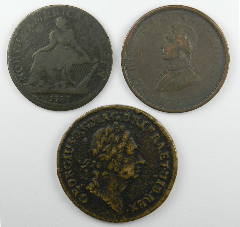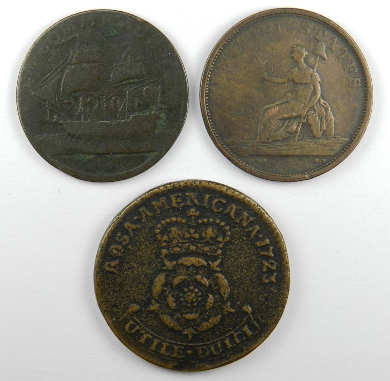 Rosa Americana Twopence, 1723, Fine-VF details, granular and pitted; North American Token, 1781, AG-Good, C/M “I. DICK” rev and Washington Cent, 1783, Small Military bust, Fine, old cleaning, fine porosity. 3 coins.
