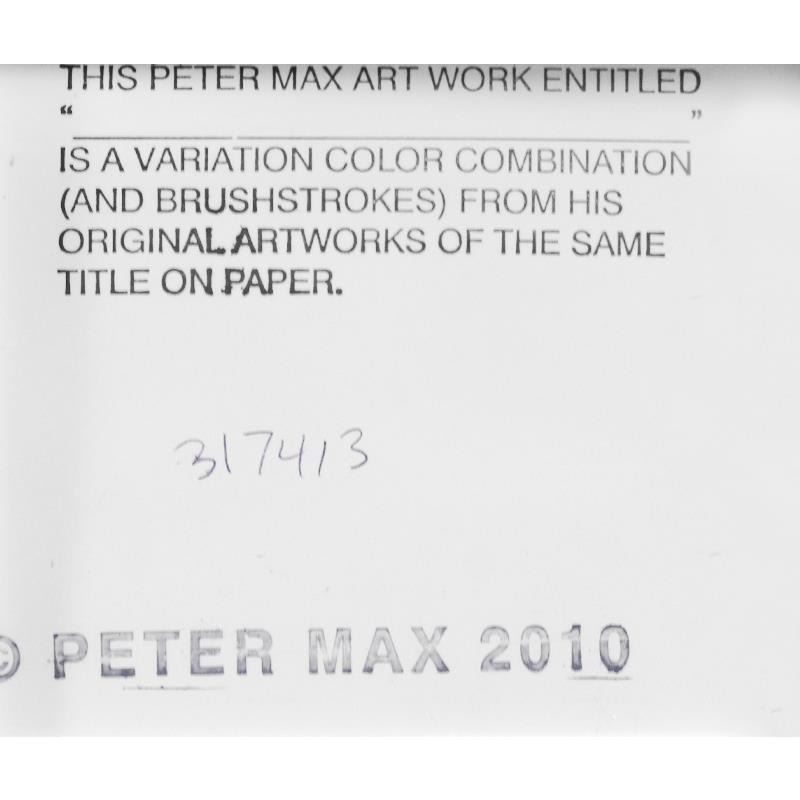 "Better World" is a one-of-a-kind acrylic mixed media on paper, hand signed by Peter Max. This piece comes custom framed. Includes Letter of Authenticity from Peter Max Studios and bears registration number inverso (317413). Measures approx. 34.5" x 46.5" (frame), 23" x 35" (image).