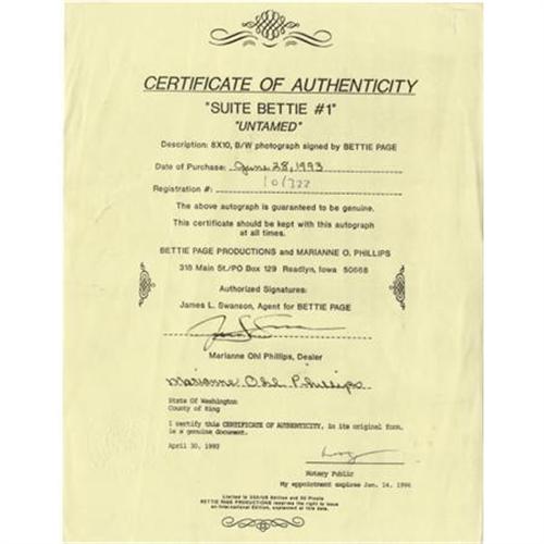 <B>Bettie Page Signed Photo.</B></I> A b&w 8" x 10" photo of the famous pin-up model in a leopard print swimsuit, titled <I>Untamed,</B></I> signed by her in black ink. In Very Fine condition with heavy silvering. <I>Accompanied by a certificate of authenticity.</B></I><BR><BR><b>Shipping:</b> Flat Material, Small (<a target="_blank" href="http://www.heritageauctions.com/common/shipping.php">view shipping information</a>)