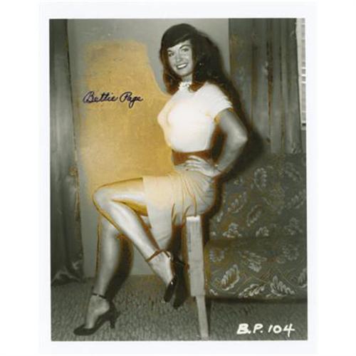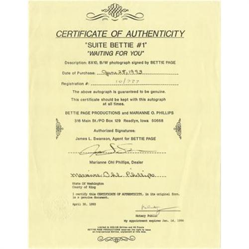 <B>Bettie Page Signed Photo.</B></I> A b&w 8" x 10" photo of the famous pin-up model in a fetching pose, titled <I>Waiting for You,</B></I> signed by her in black ink. In Very Fine condition with moderate to heavy silvering. <I>Accompanied by a certificate of authenticity.</B></I><BR><BR><b>Shipping:</b> Flat Material, Small (<a target="_blank" href="http://www.heritageauctions.com/common/shipping.php">view shipping information</a>)