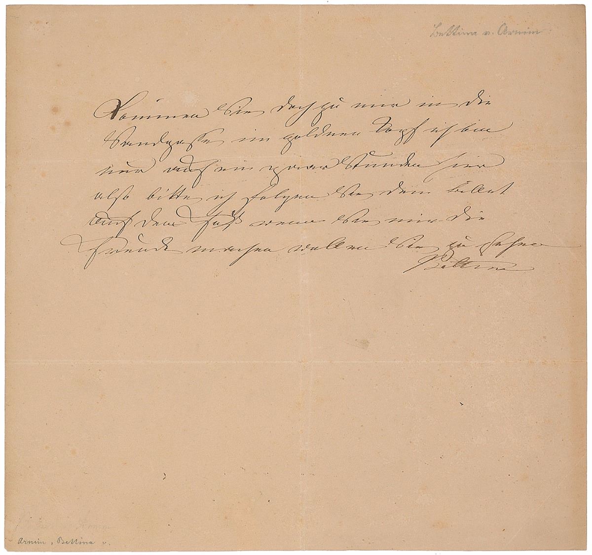 German writer and novelist (1785–1859) best known for her social circle that included the likes of Goethe, Beethoven, and Puckler. ALS in German, signed “Bettina,” one page, 8.25 x 7.75, no date. Untranslated letter of invitation to the German publicist Heinrich Oppenheim. Addressed on the reverse of the second integral page in von Arnim’s own hand. Diagonal and intersecting folds, uniform toning, and light foxing, otherwise fine condition.