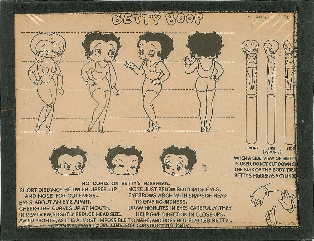 Original circa 1930s printed Fleischer Studios drawing instruction sheet for Betty Boop, 11 x 8.5, showing the character's form and face from multiple angles, with instructions including: "No curls on Betty's forehead," "Short distance between upper lip and nose for cuteness," and "Avoid profile, as it is almost impossible to make, and does not flatter Betty." The sheet is sealed under plastic against a cardboard backing with old black tape. In fine condition.