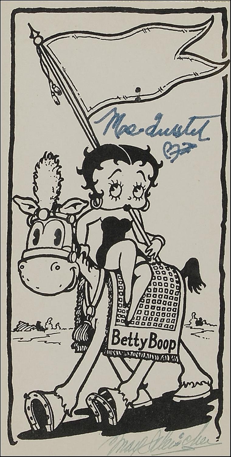 Print, 3.5 x 6.25, of Betty riding sidesaddle on a rundown nag, signed in green ink by Max Fleischer and in blue felt tip by Mae Questel, who provided Betty’s voice. Double cloth matted and framed to an overall size of 7.5 x 11. In fine condition.