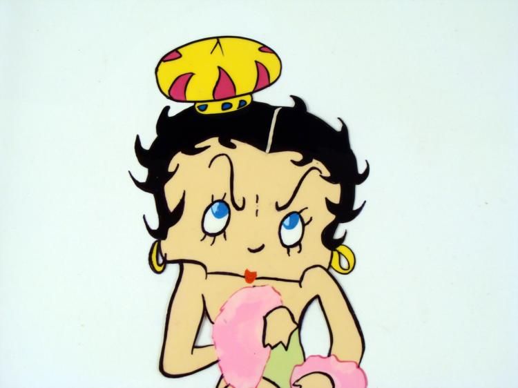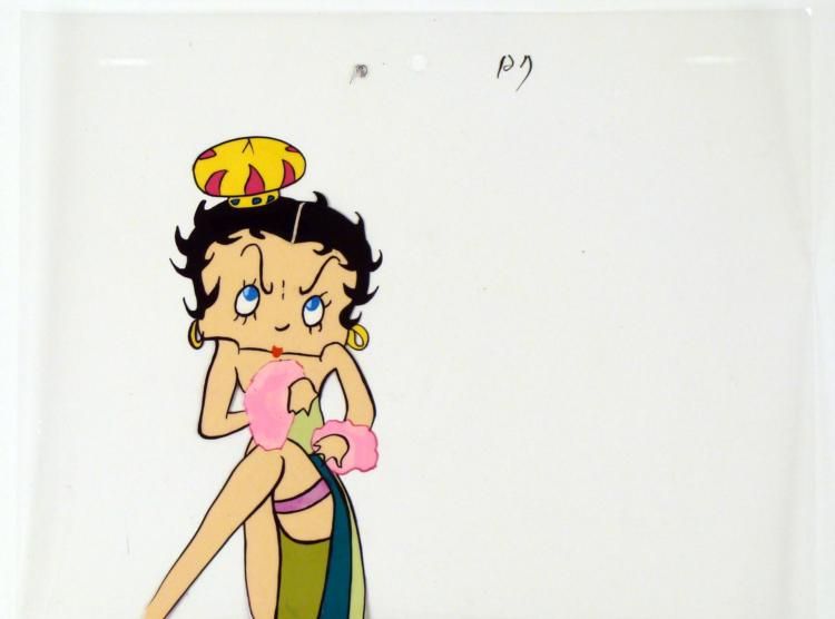Betty Boop is an animated cartoon character created by Max Fleischer, with help from animators including Grim Natwick. She originally appeared in the Talkartoon and Betty Boop film series, which were produced by Fleischer Studios and released by Paramount * Pictures. She has also been featured in comic strips and mass merchandising. Despite having been toned down in the mid-1930s to appear more demure, she became one of the most well-known and popular cartoon characters in the world. * * * * Don't mess with Betty, she means business... * * * * * Original Production Animated Cel Overall Size of Cel: 8 1/4" x 10 3/4" Very Good Condition; been stored * * * This is an original hand-painted cel set-up used in the production of an episode of Betty Boop cartoon. Each one-of-a-kind set-up represents a slight change in position of the characters. When individually photographed and projected in rapid succession, * the images appear to move. * * To create production cels, the original animator's drawing is transferred onto an acetate cel (by hand-inking and/or photo copying). The cel is then hand-painted on the reverse side. * * * The cel is ready to be matted and framed. The animator's notations are at the top of the cel. * *