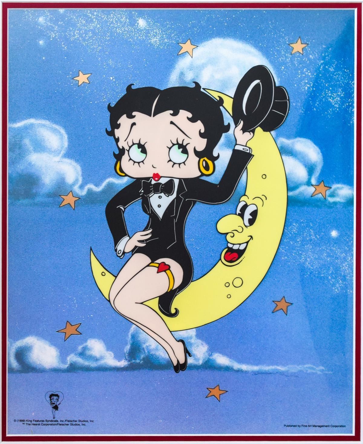 Artist: Betty Boop. Medium: Sericel. Title: Betty Boop Moon. Size (Unframed): 16" x 13". Size (Framed): 23" x 20". Certificate of Authenticity: Is included. Additional: "Betty Boop Moon" is a limited edition sericel officially licensed by King Features Syndicate, Inc. and The Hearst Collection with Fleischer Studios, Inc. depicting the cartoon favorite, Betty Boop. This piece consists of a sericel that is displayed against a vividly colored paper background. Includes Certificate of Authenticity!. Reference# 11520.