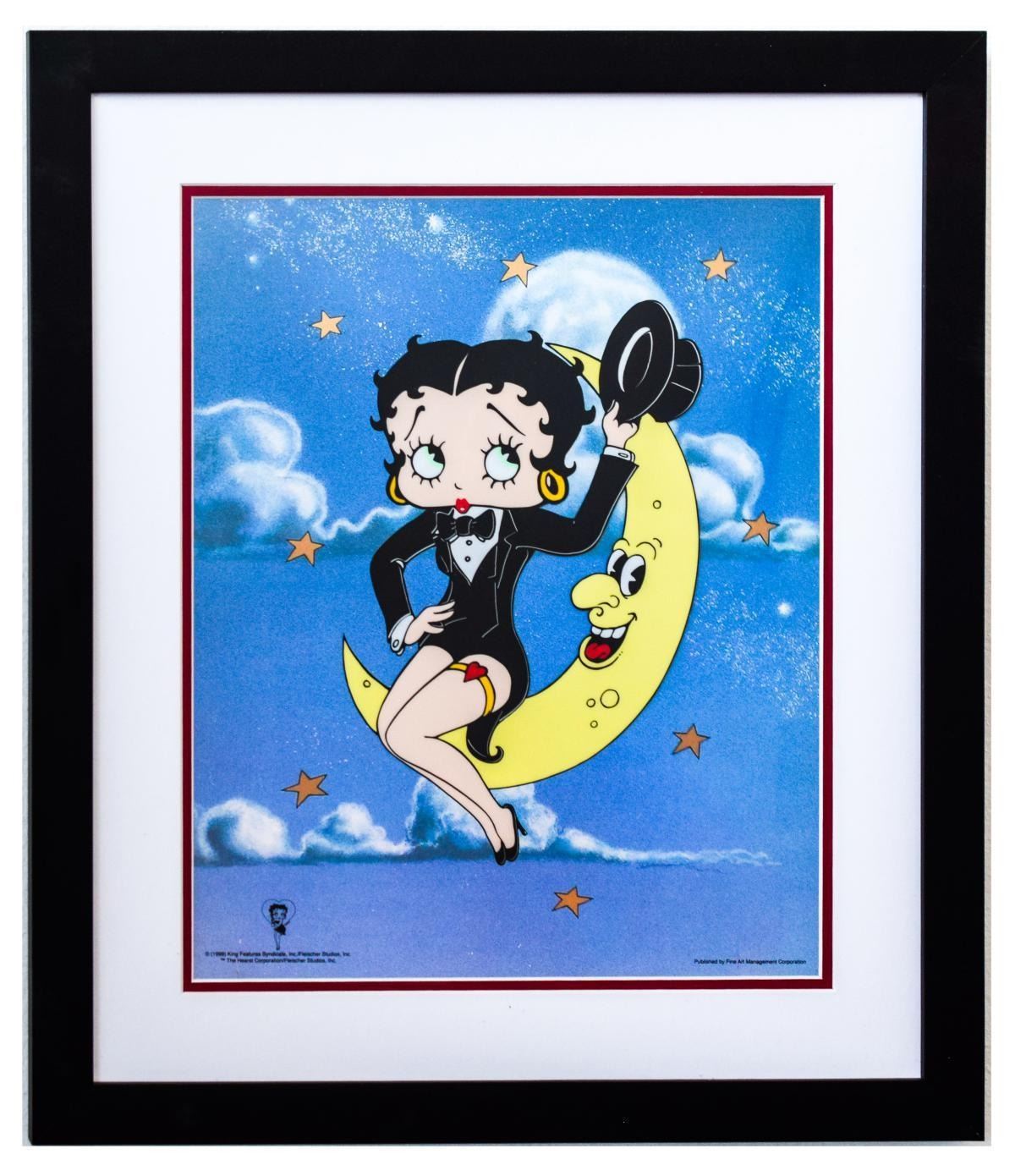 Artist: Betty Boop. Medium: Sericel. Title: Betty Boop Moon. Size (Unframed): 16" x 13". Size (Framed): 23" x 20". Certificate of Authenticity: Is included. Additional: "Betty Boop Moon" is a limited edition sericel officially licensed by King Features Syndicate, Inc. and The Hearst Collection with Fleischer Studios, Inc. depicting the cartoon favorite, Betty Boop. This piece consists of a sericel that is displayed against a vividly colored paper background. Includes Certificate of Authenticity!. Reference# 11520.
