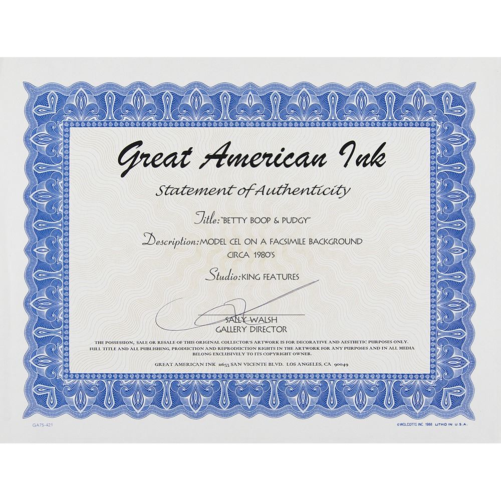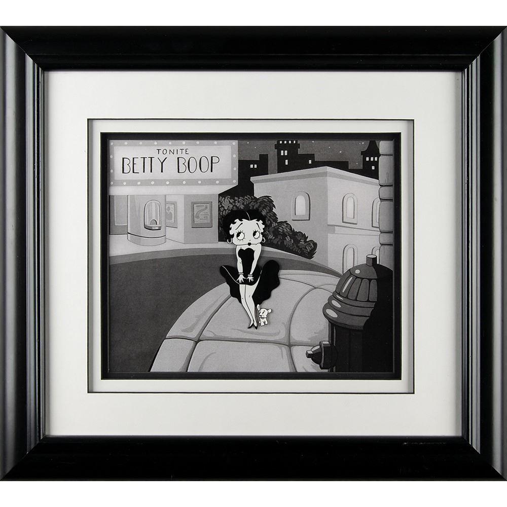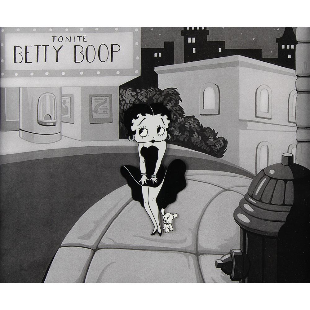 (King Features, 1980s) Original model cel of Betty Boop and Pudgy from a King Features production, which shows Betty walking next to her pint-sized pooch and pushing down her black dress in a scene inspired by Marilyn Monroe. The cel is placed on an attractive matching facsimile background of a city sidewalk with a theater marquee reading: "Tonite, Betty Boop." Total character image measures 2.5 x 5, with a mat opening of 11.5 x 9.5. Triple-matted and framed to an overall size of 20.5 x 18.75. In fine condition. Accompanied by a statement of authenticity from Great American Ink.