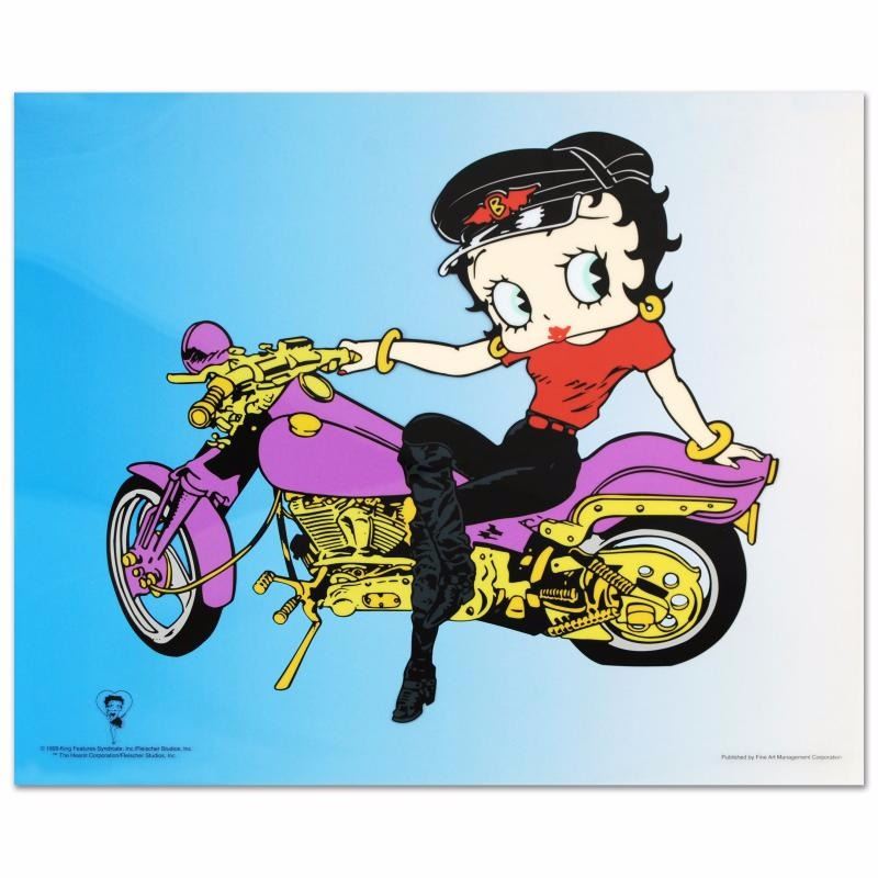 "Betty Boop on Motorcycle" is a limited edition sericel (circa 1999) officially licensed by King Features Syndicate, Inc. and The Hearst Collection with Fleischer Studios, Inc.! This piece consists of a sericel that is displayed against a vividly colored paper background. Includes Certificate of Authenticity! Measures approx. 16.5" x 13.5" (Background), 13" x 12" (image).